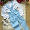TECIDO CAMISA 100% POLIESTERTECIDO DA CALÇA: 100% POLIESTER Conjunto composto por: Camisa Social na cor Branca, Gravata Borboleta na azul bebe, Calça azul bebe e suspensorio azul bebe Demais peças ou acessórios, não inclusos. BATIZADO,PAGEM,NOIVINHO