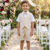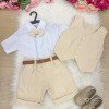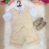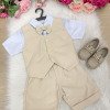 Conjunto Social Infantil Leandro Um look clássico, elegante e extremamente charmoso, ideal para casamentos, batizados, aniversários e eventos especiais. Tecidos Camisa: Microfibra 100% poliéster – leve, confortável e com toque macio. Colete e bermuda: Sarja 100% poliéster – estruturada, resistente e com excelente caimento. O conjunto é composto por: Camisa social branca de manga curta Gravata borboleta bege Colete bege com fechamento frontal por botões Bermuda bege com barra dobrada A composição em tons neutros traz sofisticação e versatilidade, permitindo combinações elegantes para diferentes ocasiões. O colete adiciona um ar formal e refinado, enquanto a bermuda mantém o visual moderno e apropriado para dias mais quentes. Informações Importantes Demais peças e acessórios da foto não estão inclusos. Calçados vendidos separadamente. Pode haver variação de tonalidade conforme a configuração da tela do seu dispositivo.